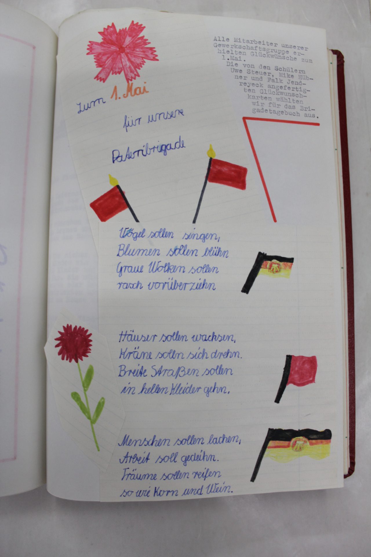 For historians today Brigadebuecher are a very interesting source of GDR history, because they document how different layers of society were linked together with socialism as their connective element. It was common for Brigade to have contractual partnerships with school classes which was, of course, documented in the Brigadebuch. From what can be seen in the diaries, these partnerships were more pretentious than real. It seemed very bizarre to read about 6-year olds congratulating the workers on the first of May or about the Brigade members sending greeting cards to children on the occasion of their newly achieved membership in the Pioneer organization.