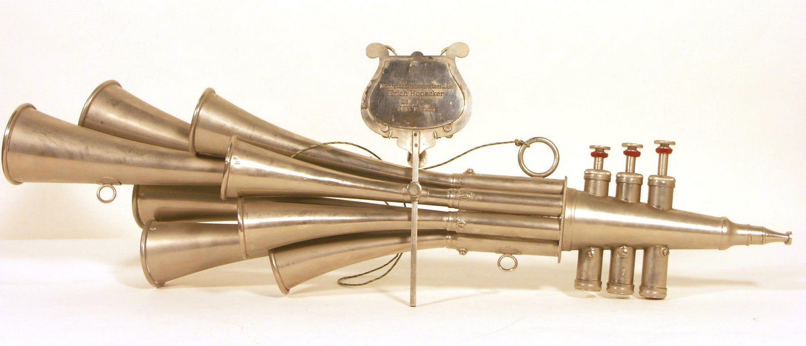 In any other context, the “Schalmei” (French chalumai, English shawm) is a completely different instrument: a woodwind forerunner of the modern oboe tracing back to the Middle Ages. How the name came to be applied to two such unrelated instruments is not clear, but this otherworldly German cousin to the military bugle is also called a Martin’s Trumpet (named for the inventor Max Martin who is also remembered for the tü-ta tü-ta still used as a horn on emergency vehicles in Germany). Where this novel instrument initially caught on was in the Saarland, that disputed coal-mining territory (Think: World War I) on the French border. Roving Schalmei bands made up of unemployed war veterans in the 1920s accompanied their socialist songs with instruments of different sizes and registers. Erich Honecker’s father is known to have played in a Schalmei band when Erich (born 1912) was a small child.
