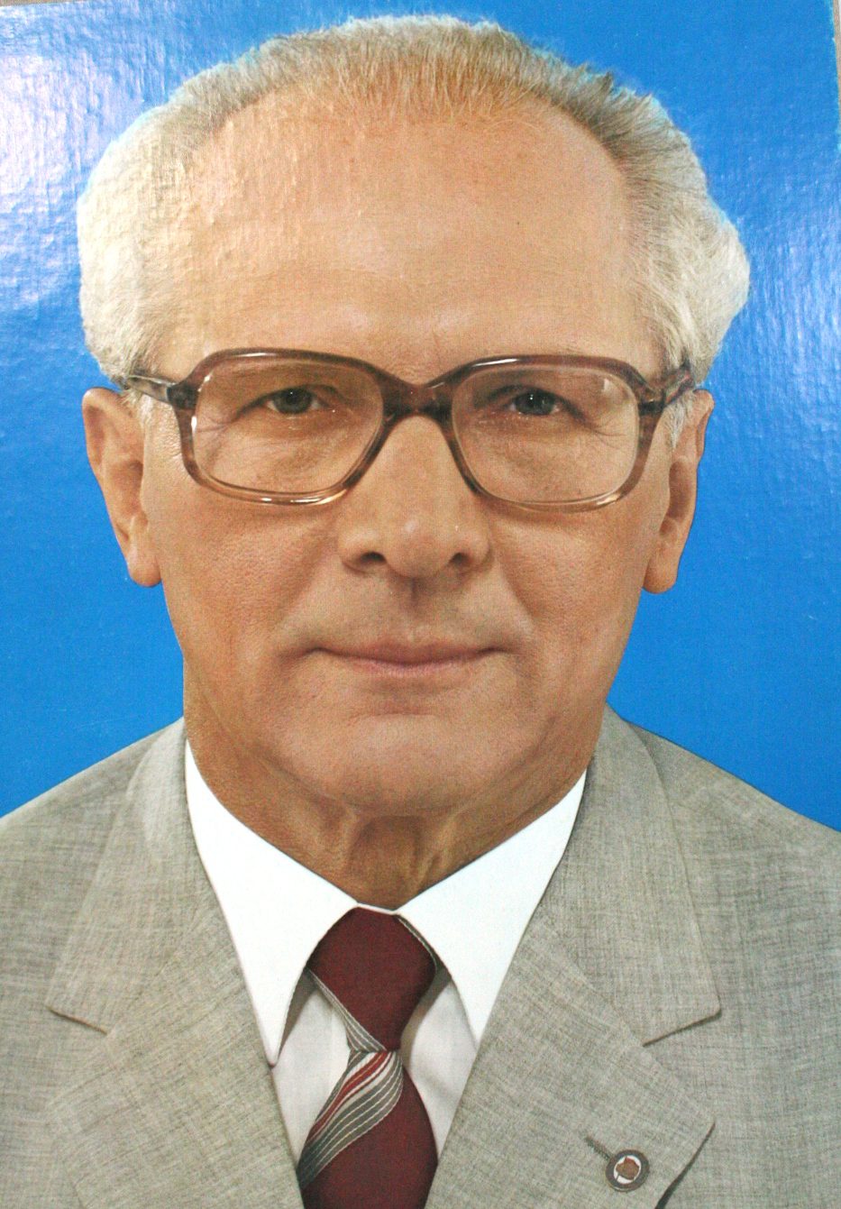 “…Honecker’s picture was everywhere. It was in schools, in Free German Youth halls, in theaters and over swimming pools. It was at the universities, in police stations, at holiday camps and in the border guards’ watchtowers. He always wore a suit and tie, large dark-rimmed glasses and his hair, first dark then grey, combed back off a high forehead.” (Funder, 58-59)