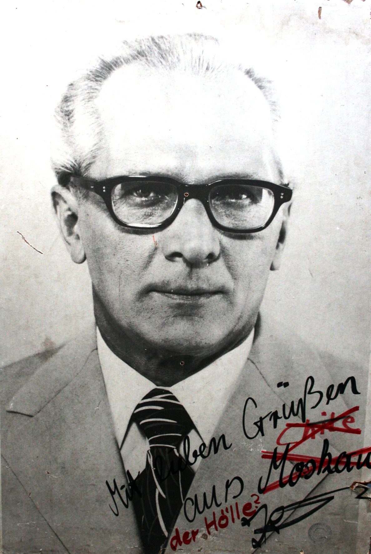 The Wende Museum has a traditional Honecker poster that was vandalized. It’s updated inscription translates as: “Fond Greetings from Moscow Chile Hell?”