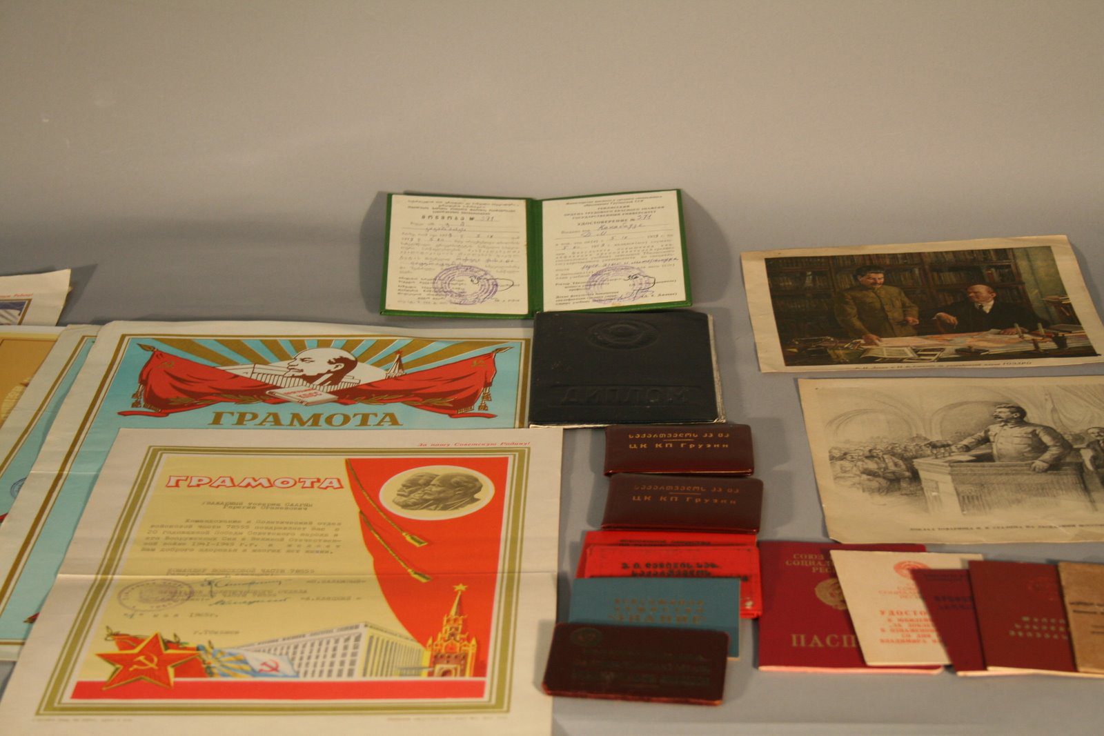 During the first half of my internship I translated a collection of 144 Soviet Era Georgian documents, including: numerous Soviet communist party membership cards, Red Army veteran awards, tickets to party meetings, central committee voting cards, and Soviet service awards, most from the 1950s-1970s. While each card presented different names and dates, the phrase Proletarii vsekh stran soediniaites’! (Proletariats of the world unite!), and portraits of Lenin appeared constantly on documents. This collection revealed that the Soviet Union acquired extensive documentation of their citizens. These state published documents also encouraged citizens to honor the communist state. The Soviet Union rewarded citizens that continued Lenin’s vision of building a proletarian world through service awards presented on days that commemorated the October Revolution and Victory Day. The state published documents from the pre-glasnost period showed unwavering patriotism for the Soviet Union.