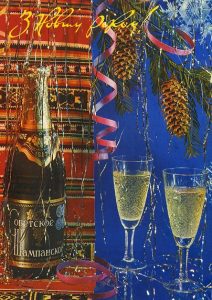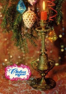 While Hanukah and Christmas celebrations were heavily discouraged due to their religious affiliations, the Soviet authorities realized that many people were used to observing a winter holiday and thus attempted to transfer people’s wintertime celebratory zeal onto a secular celebration of the Novy God. This transfer was extremely effective and many Jews and Christians alike were enthusiastic about this secular holiday, not only because it allowed for gift giving, special holiday meals and heavy drinking (including the drinking of Soviet champagne: see image), but also because many of the rituals and symbols the State chose to represent Novy God were reminiscent of Christian (and perhaps even Jewish) rituals. For example, two prominent motifs associated with the holiday were the Novy God fir tree decorated with ornaments, lights and a star, as well as two stories and icons featuring “Grandfather Frost,” an elderly white-bearded, gift-distributing man resembling Santa Claus. Another icon with possible religious origins that was used on many Novy God cards was a lit candle, which perhaps was supposed to be a reference to the lighting of candles on the Menorah during Hanukah (see image) and is a symbol Christians use during the Christmas season as well.