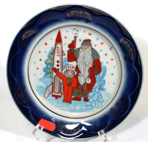 Some say that part of Novy God’s widespread appeal can be attributed to its lack of a Soviet-ideological basis, (unlike May Day, the Great October Soviet Revolution Day or other worker-oriented holidays created by the Soviet regime). “It was the best, cleanest, most joyful holiday. It was completely clean of ideology,”(Boston.com) said Masha Buman, a woman currently living in Israel but originally from the U.S.S.R. However, while not “based” on Soviet ideology, the state still used Novy God material culture as a vehicle for pro-Soviet messages and iconography. Frequently, images on Novy God cards not only depicted non-political idyllic winter landscapes, Father Frost or Novy God trees, but also incorporated Soviet motifs like the hammer and sickle, cosmonauts and graphics showcasing the might of Soviet industry. This iconography was probably fueled by the State’s desire to use people’s enthusiasm for Novy God to engender goodwill towards Soviet aims. An excellent example of this can be seen in a decorative plate in the Wende collection depicting Grandfather Frost holding a watch standing with a happy child wearing a “CCCP” helmet next to a Soviet rocket (see below).