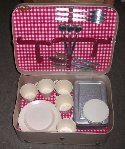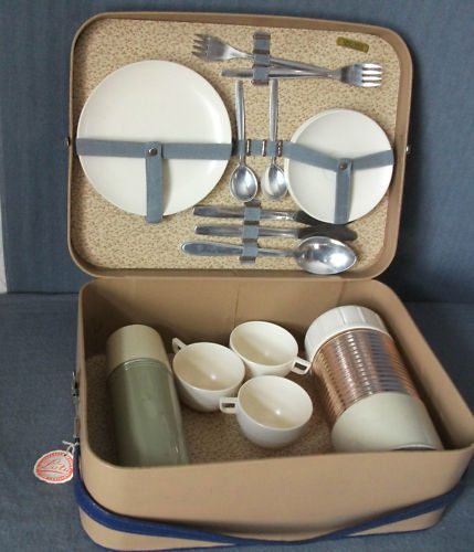 These are two examples of typical picnic containers that were used to carry necessary dishes, utensils, food, and beverages.