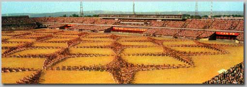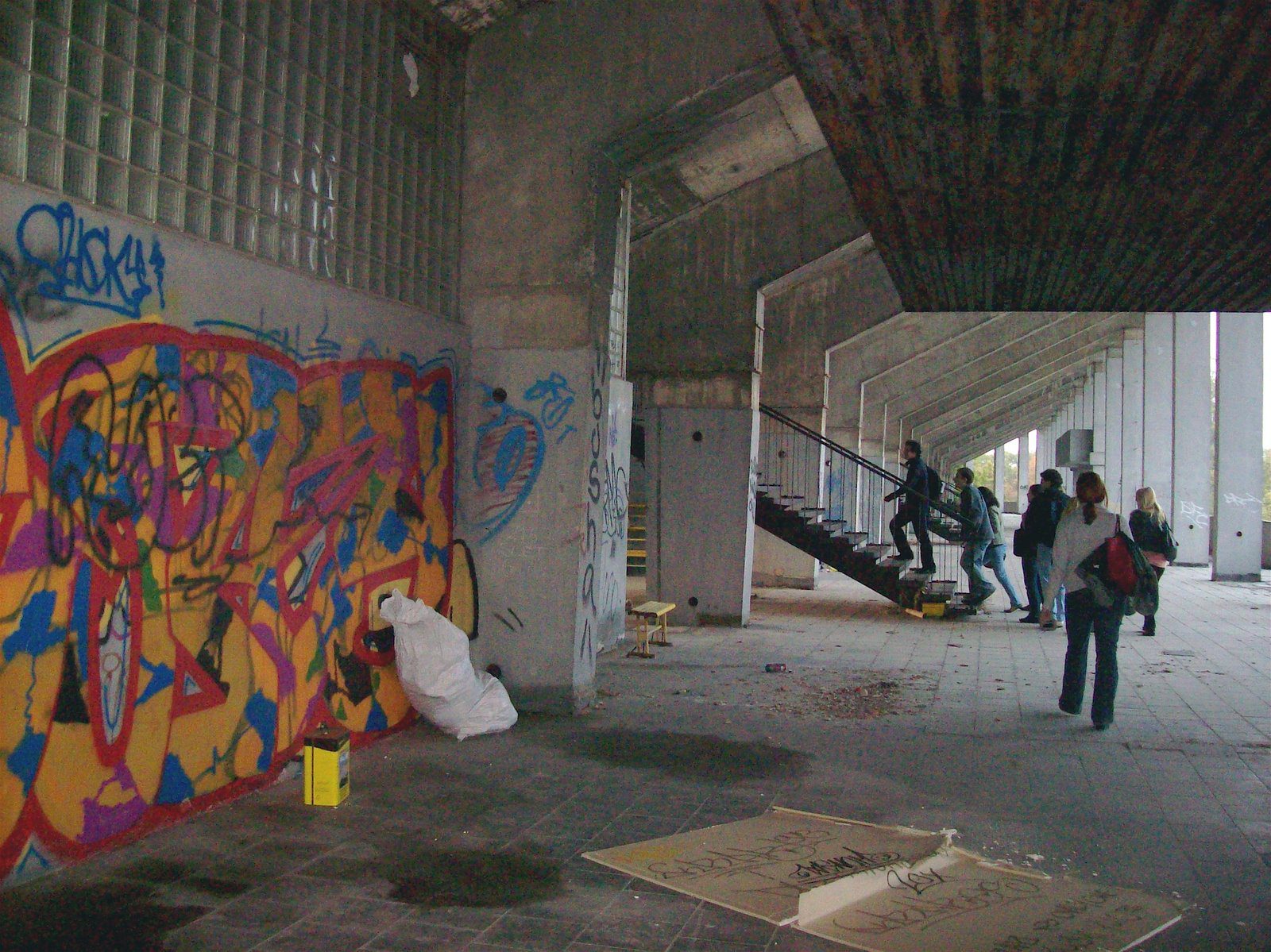 One such building is Strahov Stadium on top of a hill overlooking Prague. It is hard to imagine that this gigantic stadium could fall into reletive obscurity, especially considering that it is the world’s largest stadium with room for over 8 soccer fields inside. As my proffessor led us past the practice fields, past the barriers keeping the public off the structure, and up the broken stairs of the stadium overgrown with weeds, he explained the former glory of the stadium as a venue for mass gymnastics. Mass gymnastics in Strahov Stadium were performances of synchronized mass movements, organized and performed by the Czechoslovak Spartakaids every five years in celebration of the country’s liberation by the Red Army. Mass gymnastics performances were used under communism for “the display of strong, young, beautiful and disciplined bodies [that offered] an attractive reading of society as a whole and consequently legitimizes the leadership as a promoter or creator of such a society” (Roubal, Politics of Gymnastics). For more information on mass gymnastics read my professor Petr Roubal’s article “Politics of Gymnastics: Mass Gymnastic Displays under Communism in Central and Eastern Europe” or http://www.osa.ceu.hu/galeria/spartakiad/online/index2.html