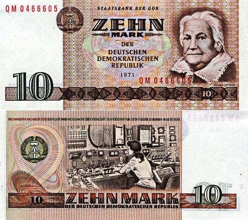 The front of this bill depicts Clara Zetkin, a passionate German feminist, communist and famous initiator of the International Women’s Day. To make this important woman the front of an everyday bank note reflects the importance that was ideologically given to the equality of women. The back of the bill shows a woman working at a control center in an industrial setting. It is interesting to note that this artistic choice deviates from usual romantic depictions of women, e.g. as the bearers of the nation (see for example the 50 Pfennig coin of West Germany showing a woman planting a German oak tree) or the personification as a young and strong woman (see for example the French Marianne).