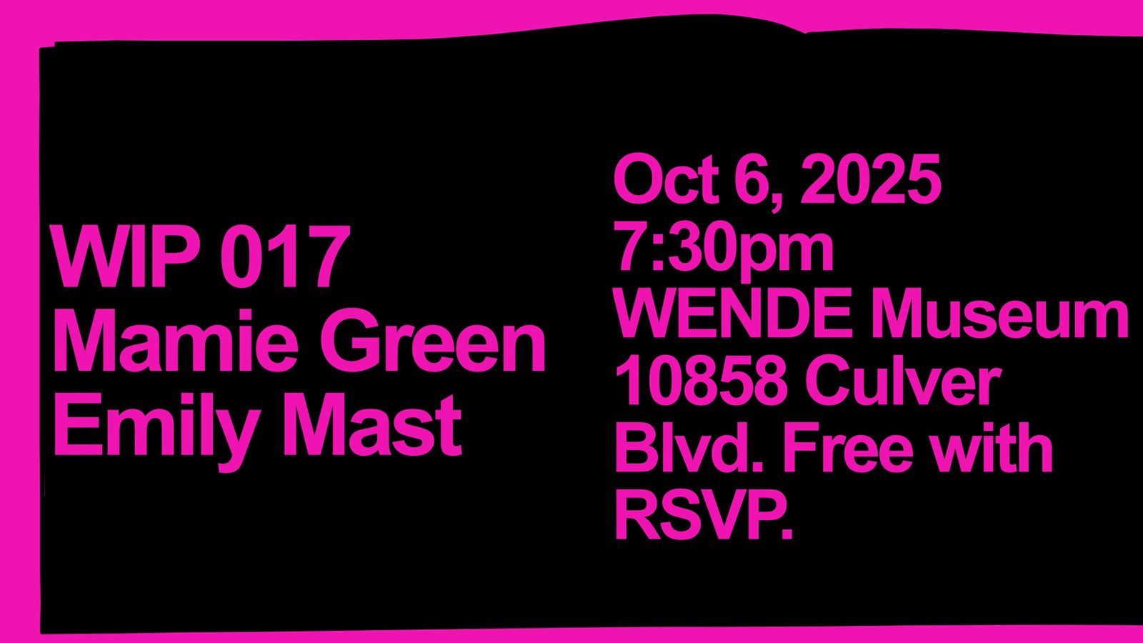 WIP 017 marks our first WIP of many at The Glorya Kaufman Community Center at the Wende Museum and will feature work-in-progress by Mamie Green & Emily Mast. There will be a post-show moderated talk-back with the artists.